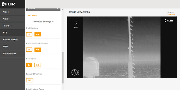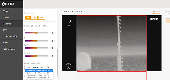 05.02.2023 - Camera FLIR.После отключения / включения или замены камеры FLIR M364С настройки камеры (изображение и управление) сбрасываются по-умолчанию в такое состояние, когда крепление камеры находится снизу. В нашем случае крепление камеры находится сверху, т.е. камера находится в подвешенном состоянии, соответственно необходимо перевернуть изображение и изменить управление.Для этого необходимо зайти на веб-интерфейс камеры, через соответствующий IP-адрес в браузере, ввести логин пароль. Далее заходим и выбираем следующие настройки:Terminal → Mirroring/Inversion -->> Ball down Off / Rearview Off