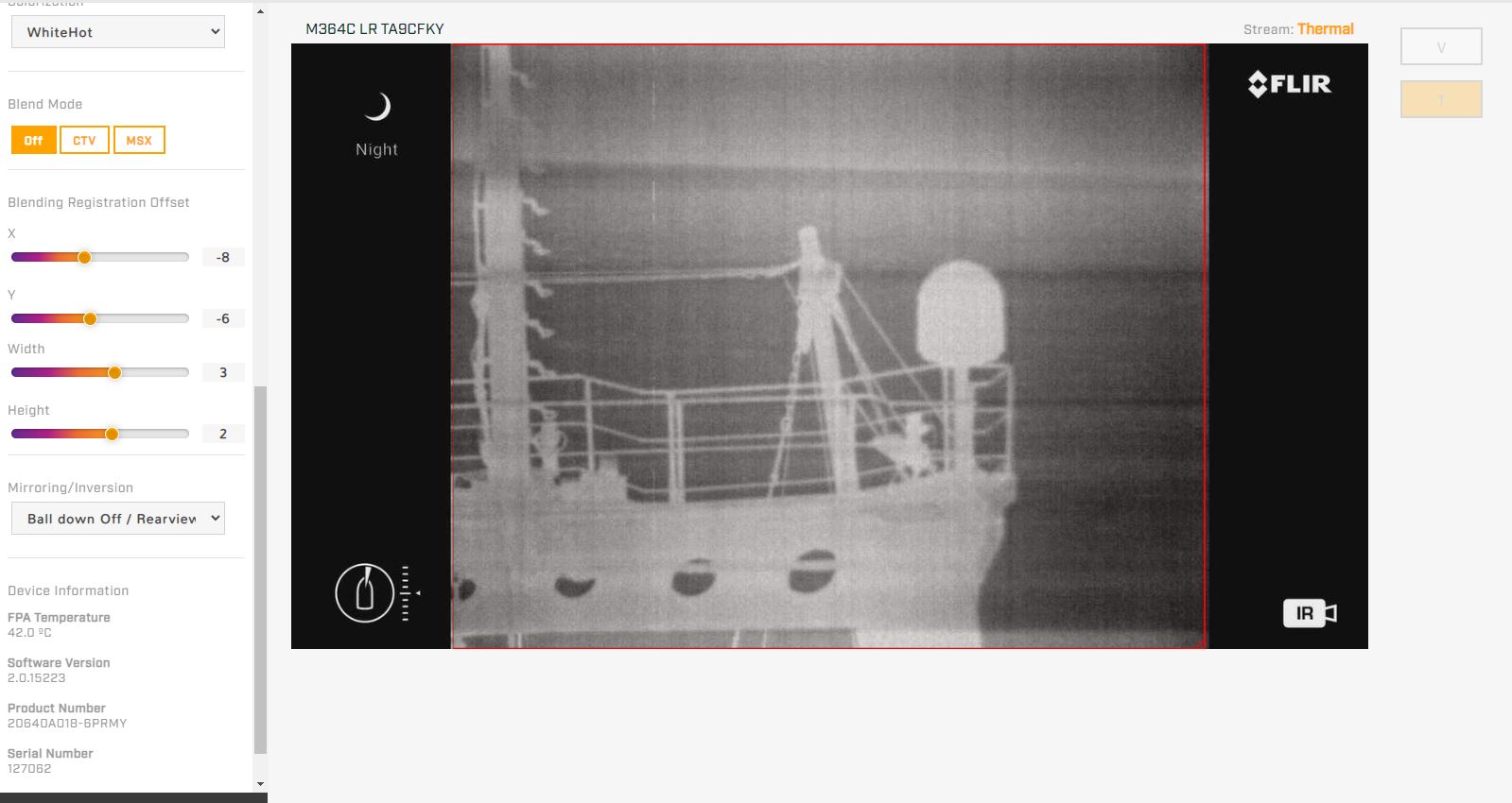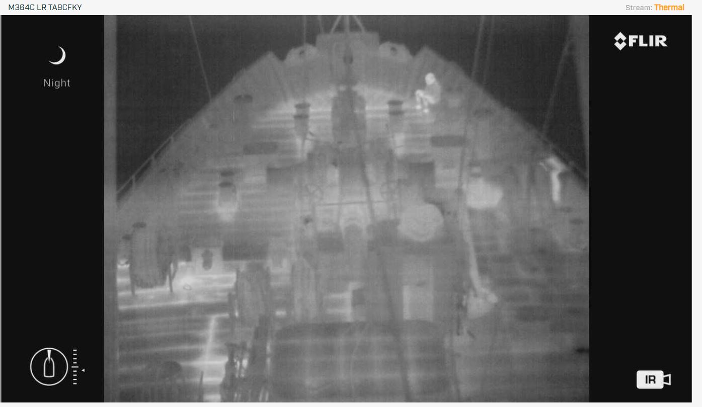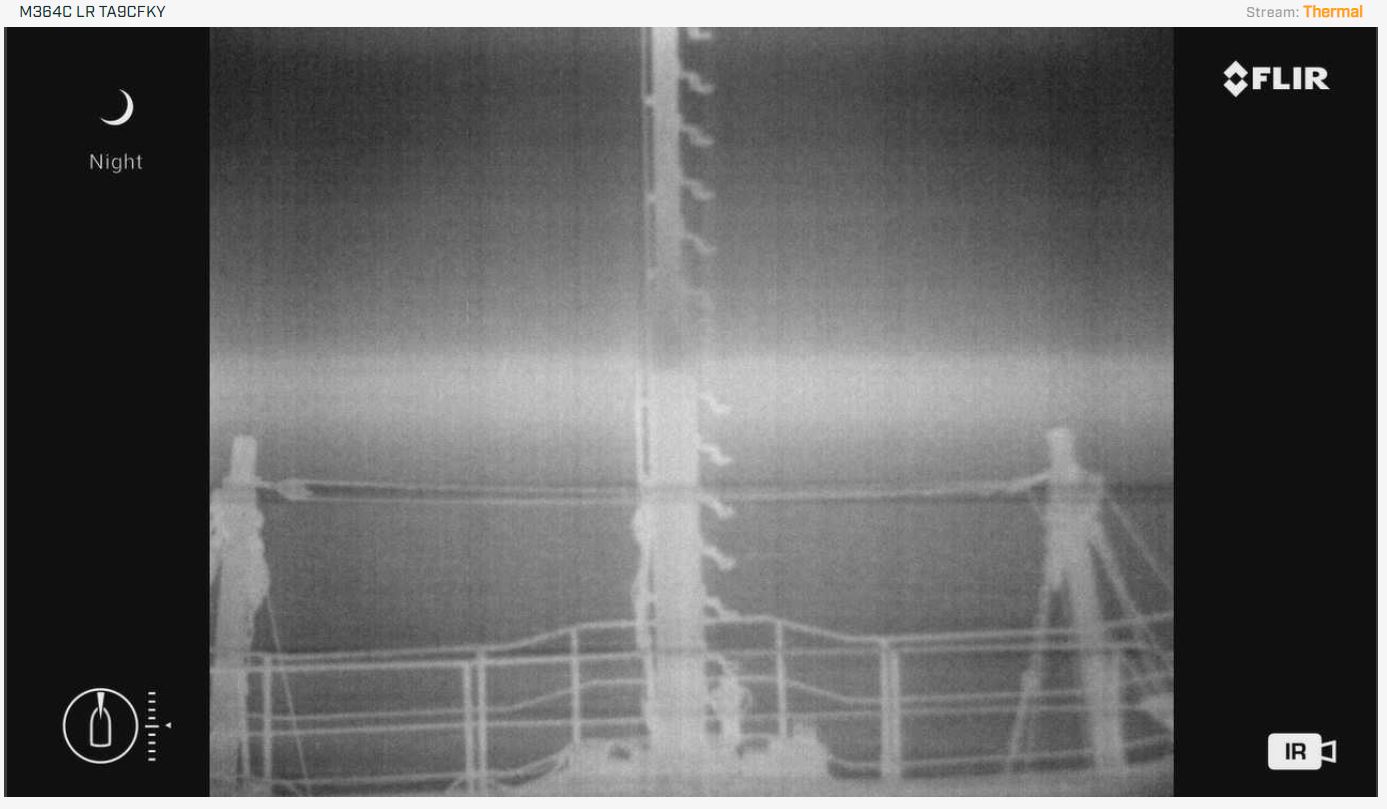 После установки камеры флир, у штурманского состава появились притензии по поводу качества отображаемой картинки с термокамеры FLIR 300M. При наведении камеры по курсу, отсутсвует какое либо термальное отображение (поверхноть моря, неба, не видно контуров лодок). При этом контуры судна отображаются корректно, если камеру навести на фальштрубы судна, то контуры разности темературы отображаются отлично. Фото данных примеров приложены ниже.