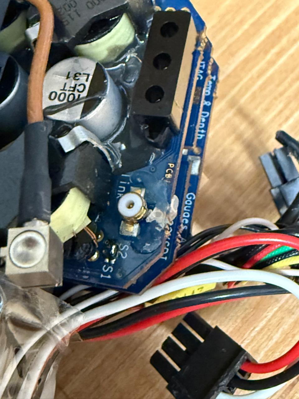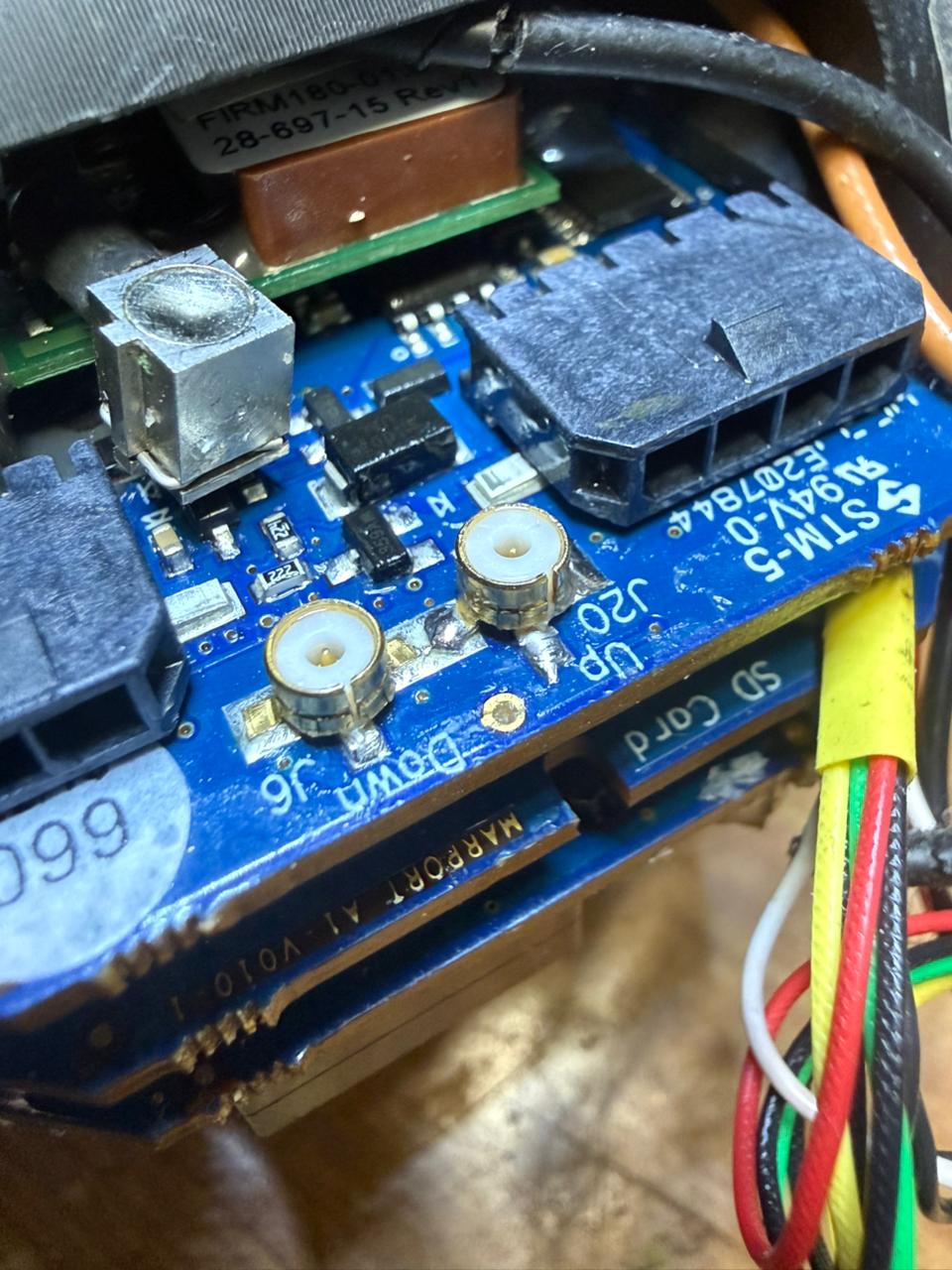 На осмотре - зарядка полная, при принудительной активации датчика не слышно посылок сигнала. Разбор датчка. Все коаксильные провода на месте, но один вызывает подозрение того как он сидит на месте. Отключил коаксиальный провод - осмотр.