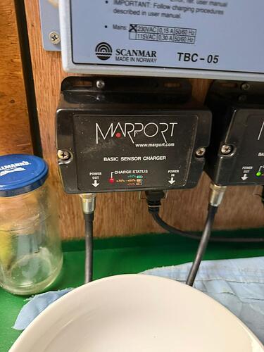 После подъёма трала TE был поставлен на зарядку (через «медузу» - ночью и через Basic Sensor Charger-днем) — индикатор красный. Простоял всю ночь — никакой реакции, лампа как горела красным, так и осталась.