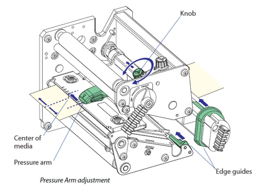Принтер настроен на заводе для печати на носителях полной ширины. При использовании более узких носителей отрегулируйте прижимной рычаг так, чтобы он оставался по центру носителя и равномерно прижимал его. Неправильно отрегулированный прижимной рычаг может проявляться в виде более слабого печатного изображения по обе стороны от носителя. Для регулировки прижимного рычага: