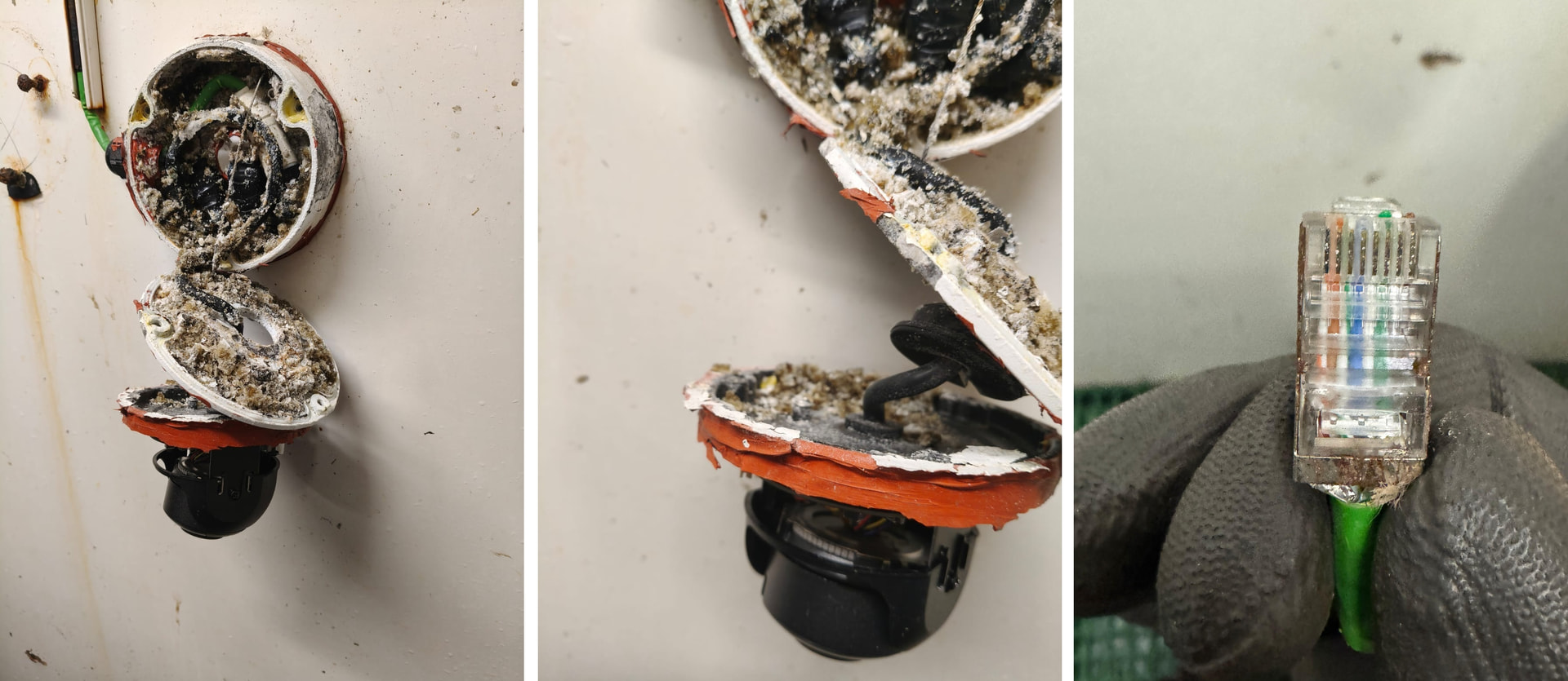 - Разобрал старую камеру и выявлено критическое нарушение герметичности монтажной коробки, которое повлекло за собой систематическое проникновение морской (забортной) воды по время замывки шкафов, рядом с которыми установлена данная камера (в 1,5 метрах). Это привело к образованию кристаллизованных солевых отложений внутри корпуса и на контактных группах.